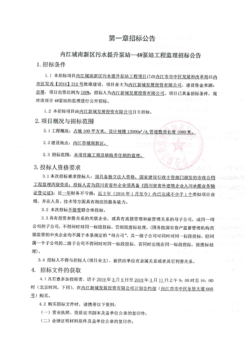 內(nèi)江城南新區(qū)污水提升泵站—4#泵站工程監(jiān)理招標(biāo)公告